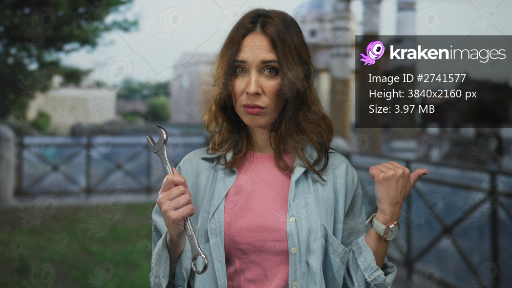 Young hispanic woman holding wrench stands in front of ancient roman ruins outdoors, blending modern tools with historic city setting.