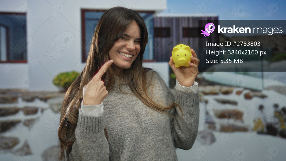 Young hispanic woman holding yellow piggy bank and smiling outdoors in urban city street with modern building background highlighting savings and financial planning concept - Kraken Images