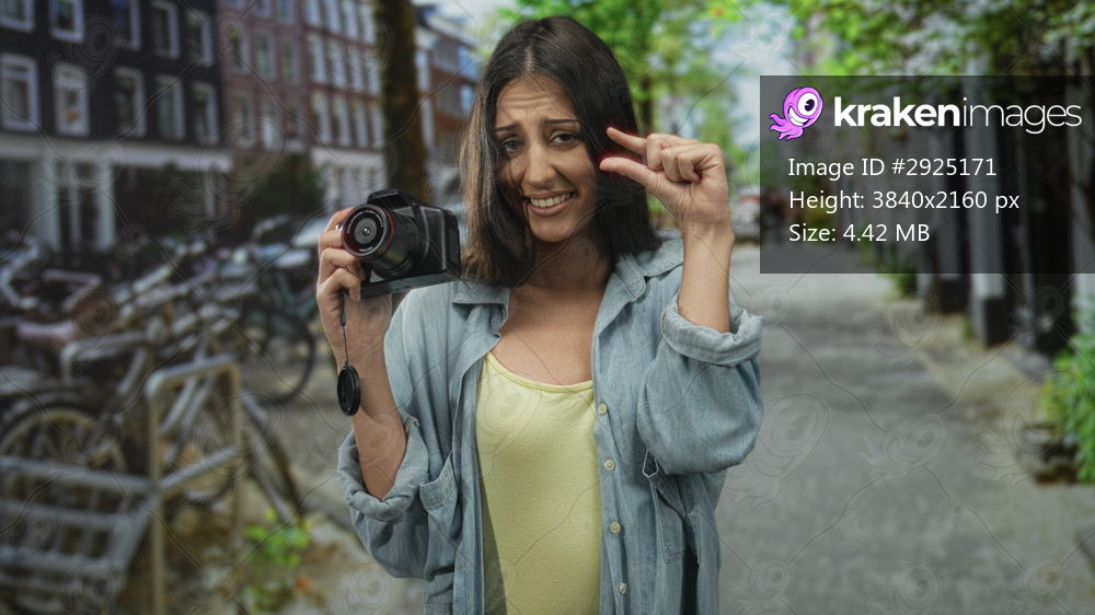 Young hispanic woman holds a camera with one hand and pinches fingers near the lens while standing on a cobblestone street; playful curiosity.
