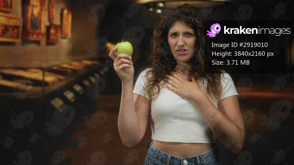 Young hispanic woman holds a green apple, hand on chest, in gallery building among framed paintings and display cases; disgust doubt.