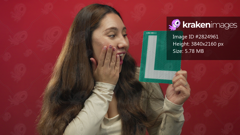 Young hispanic woman holds a green l plate and smiles in studio setting; confidence progress practice achievement.
