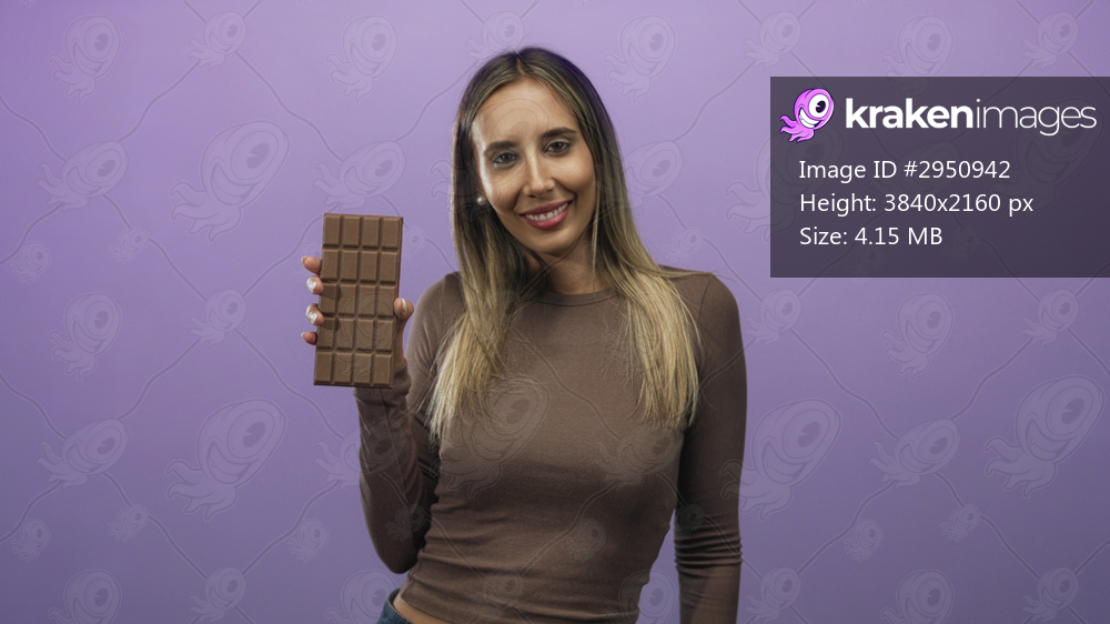 Young hispanic woman holds a large chocolate bar with one hand and smiles at camera in purple studio; sweet snack joy.