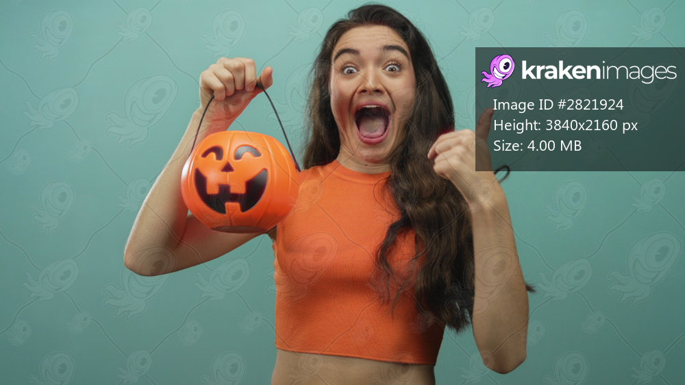 Young hispanic woman holds a pumpkin bucket and points finger at it in a teal studio; festive excitement.
