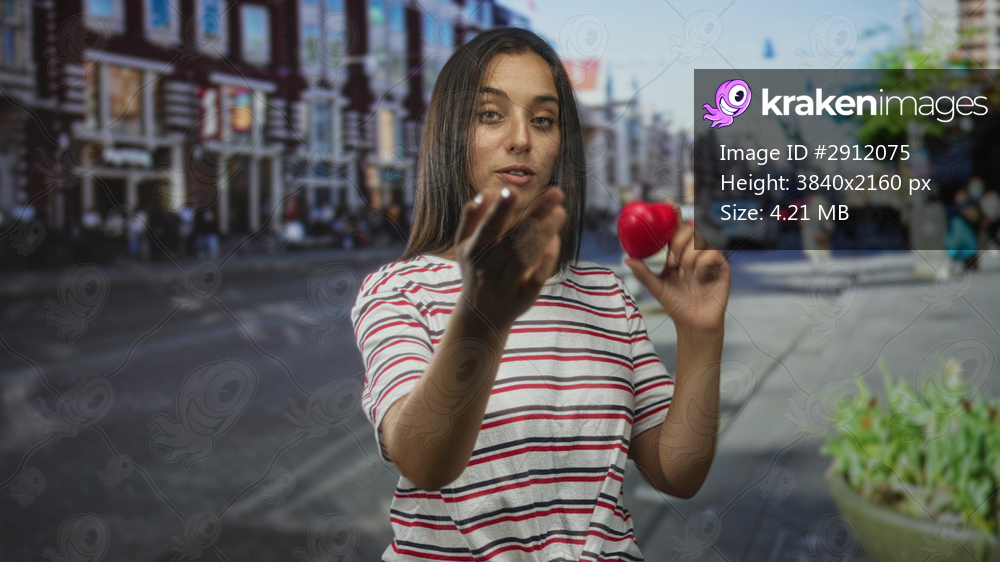 Young hispanic woman holds a red heart and shows palm toward camera on a busy street with blurred buildings and planters; unrequited love longing.