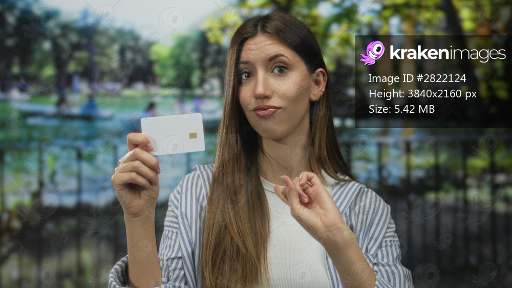 Young hispanic woman holds blank card with finger pointing near pond in forest; financial uncertainty and hesitation.
