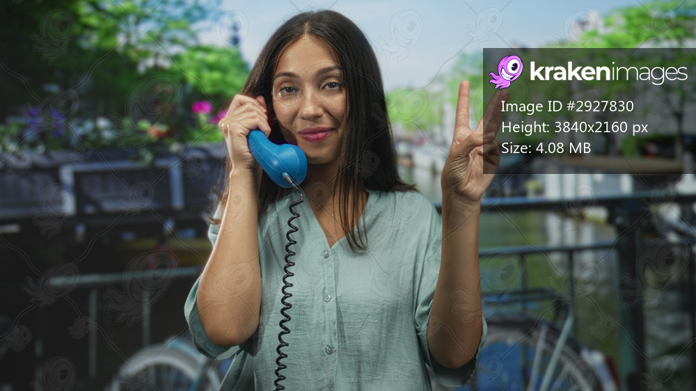 Young hispanic woman holds blue handset to ear and makes peace sign on street in amsterdam; playful connection.