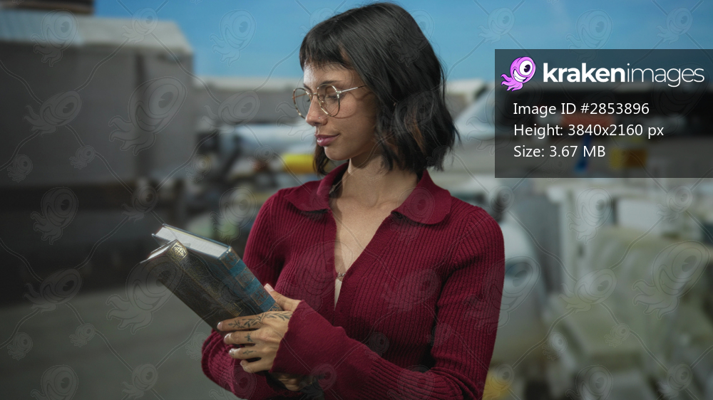 Young hispanic woman holds book and points finger in airport terminal with serious gaze; confidence.