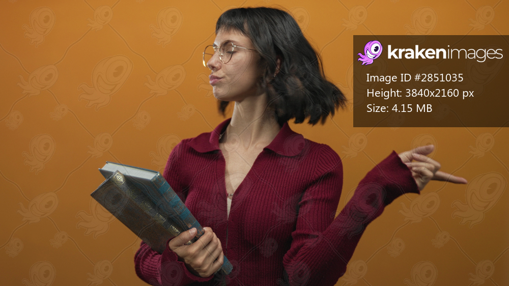 Young hispanic woman holds books and points finger to books in a studio; determination knowledge focus.
