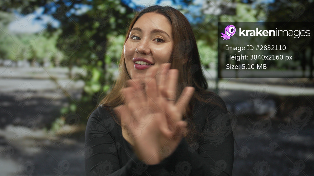 Young hispanic woman holds both palms forward on sunlit green park path lined with trees; assertion confidence empowerment strength.