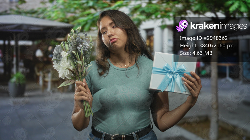 Young hispanic woman holds bouquet in one hand and a gift box with blue ribbon on a city street outside cafe storefront, neutral posture; disappointed. - Kraken Images