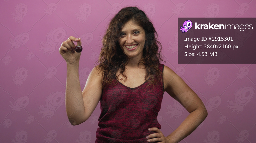 Young hispanic woman holds cherry between fingers and smiles at camera with one hand on hip in studio with pink backdrop; playful.