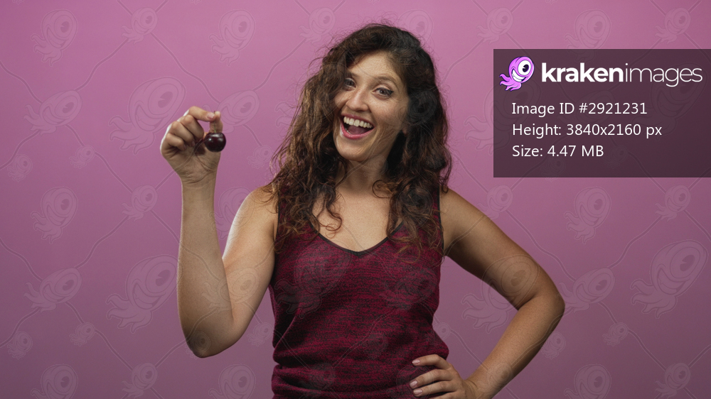Young hispanic woman holds cherry between fingers and smiles at camera with one hand on hip in studio with pink backdrop; playful.