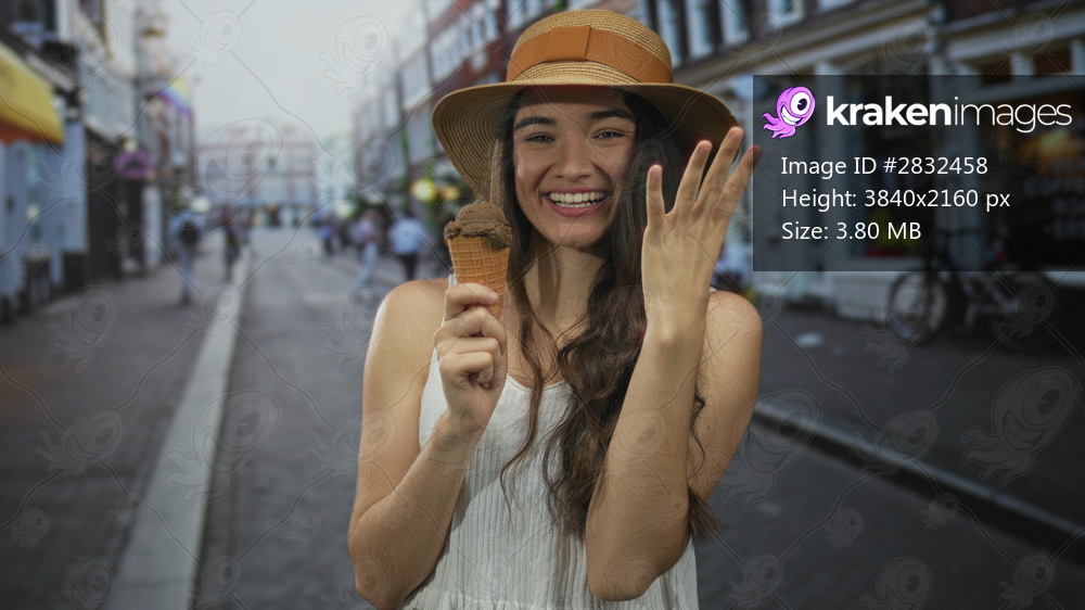 Young hispanic woman holds chocolate icecream cone while bringing finger to lips on busy street; savor joy.