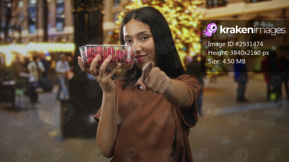 Young hispanic woman holds clear plastic container of strawberries with hand at chest on street holiday market with blurred crowd and lights; happiness sharing. - Kraken Images