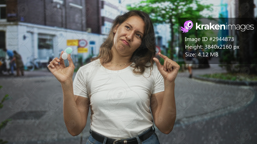 Young hispanic woman holds contact lens case between pinching fingers while squinting and grimacing on a city street; skeptical eye care.