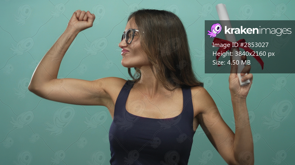 Young hispanic woman holds diploma scroll and clenches fist with flexed bare arm in teal studio; pride success.