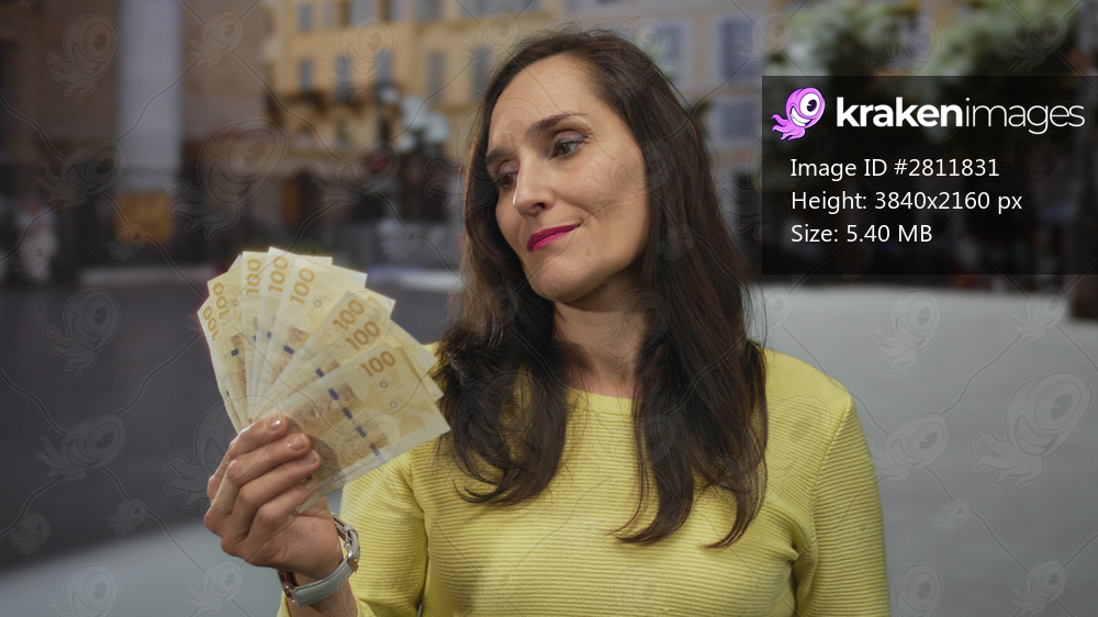 Young hispanic woman holds fanned swedish krona banknotes in hand on urban street; wealth doubt frustration skepticism.