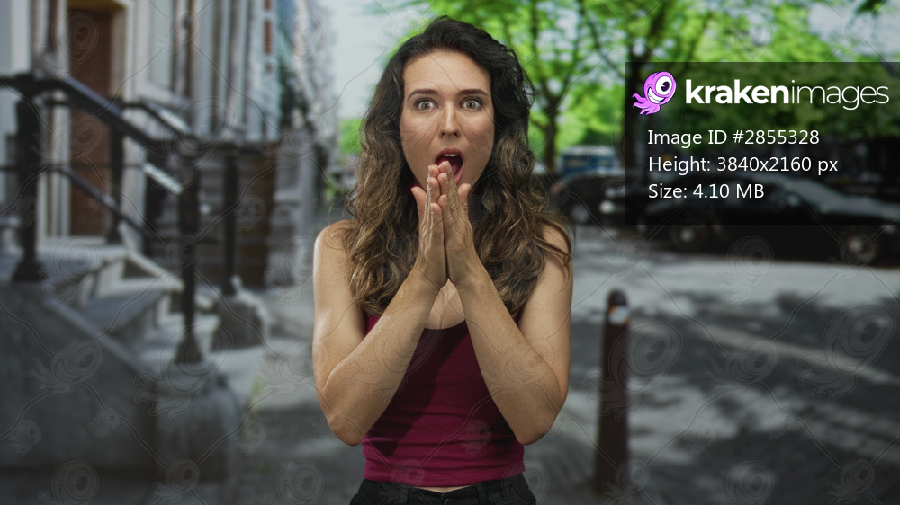 Young hispanic woman holds fingers near chin with open mouth on bustling city street; surprise.