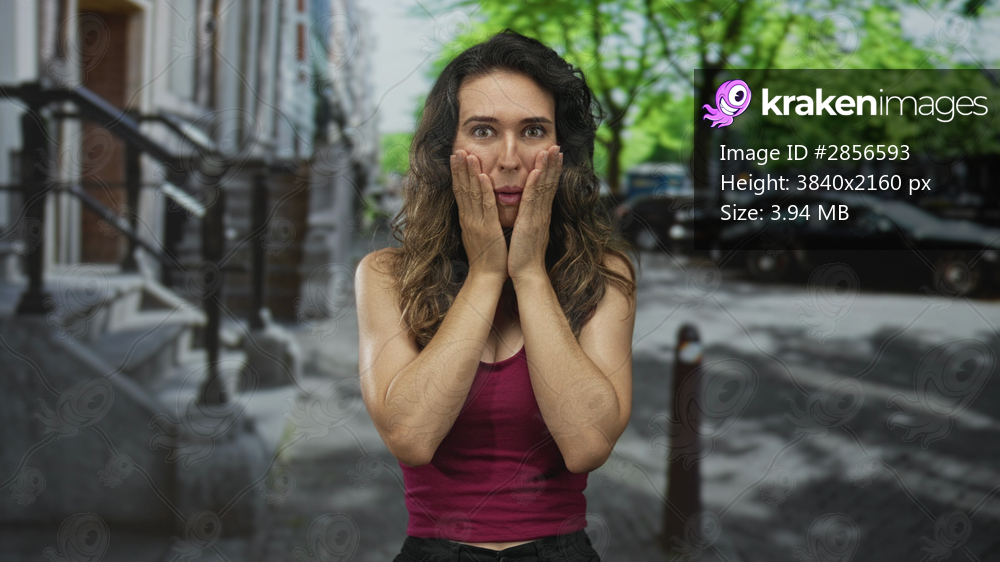 Young hispanic woman holds fingers near chin with open mouth on bustling city street; surprise.