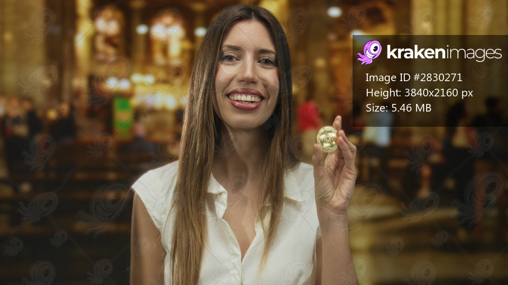 Young hispanic woman holds gold coin between fingers amid church pews under warm lighting; faith hope.