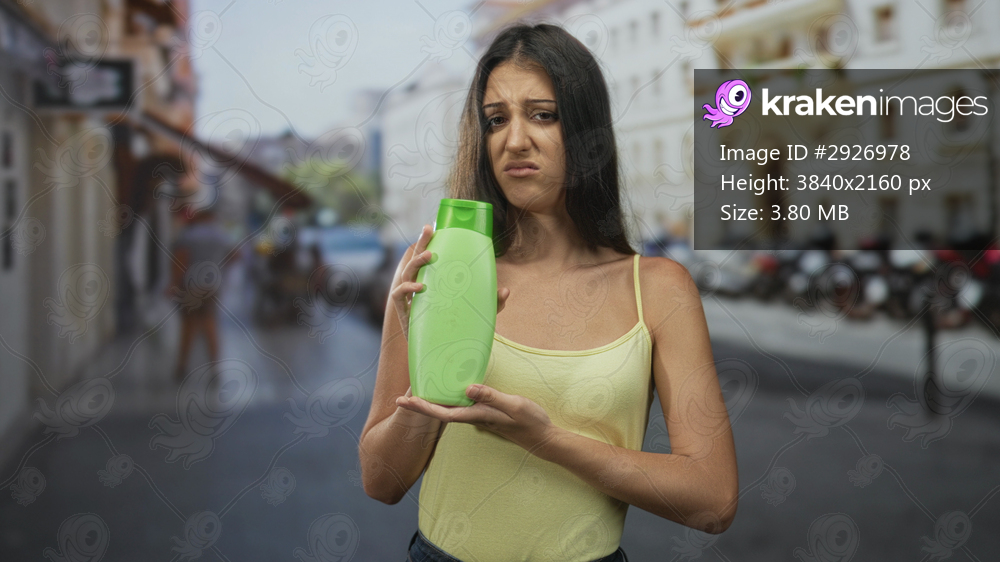 Young hispanic woman holds green shampoo bottle with a disgusted grimace while presenting it on a city street; product skepticism disgust.