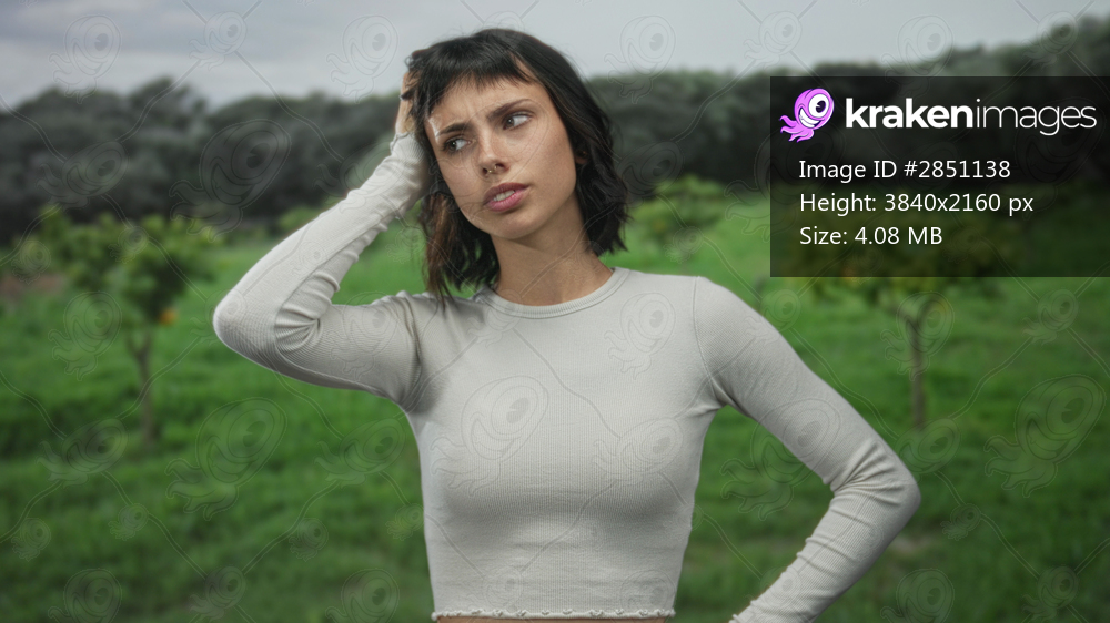 Young hispanic woman holds hand to head in a lush green forest orchard setting with visible trees and grass expanse; confusion doubt reflection thought. - Kraken Images