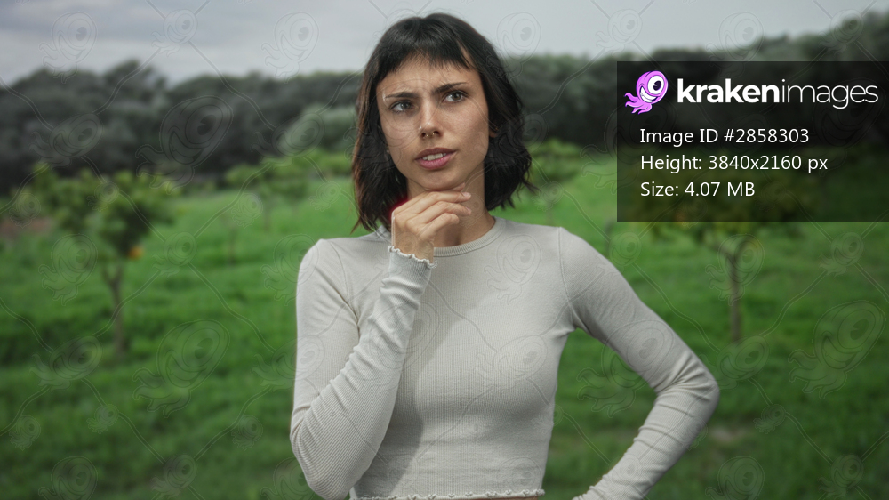 Young hispanic woman holds hand to head in a lush green forest orchard setting with visible trees and grass expanse; confusion doubt reflection thought. - Kraken Images