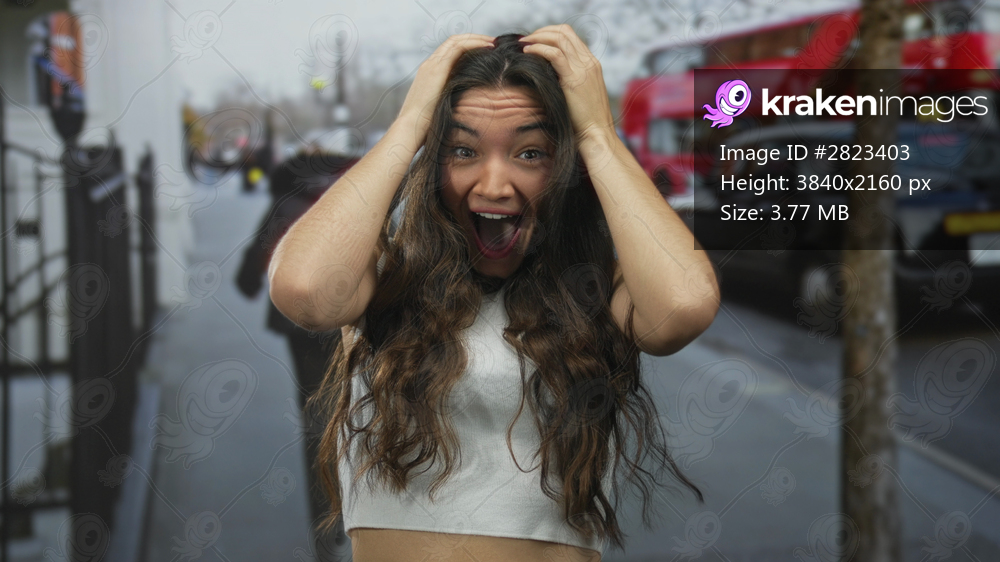 Young hispanic woman holds hands on head on crowded urban street with mouth open in shock; astonishment.