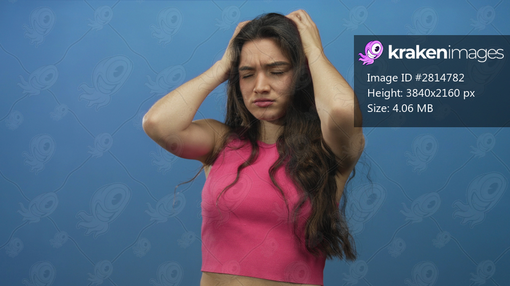 Young hispanic woman holds head with both hands in blue studio with closed eyes and clenched jaw expressing discomfort; stress.