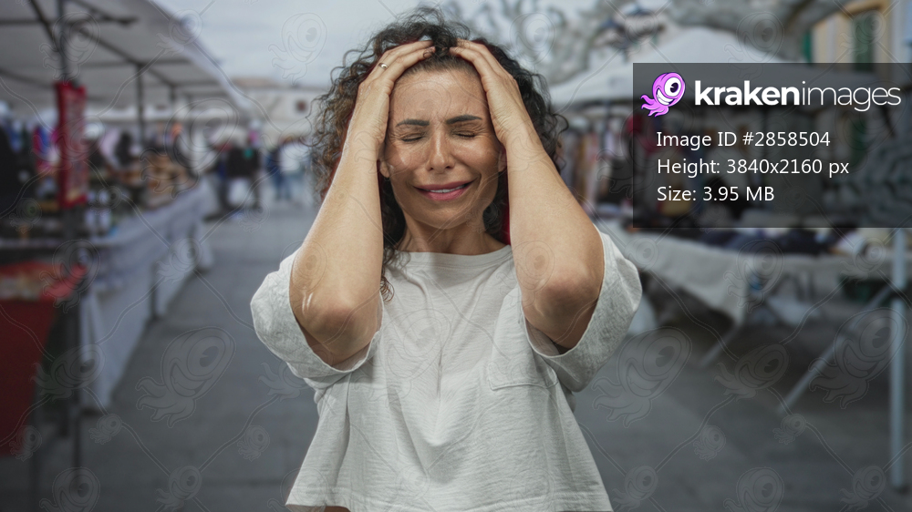 Young hispanic woman holds head over souvenirs in bustling city street open air market stalls; frustration shopping fatigue.