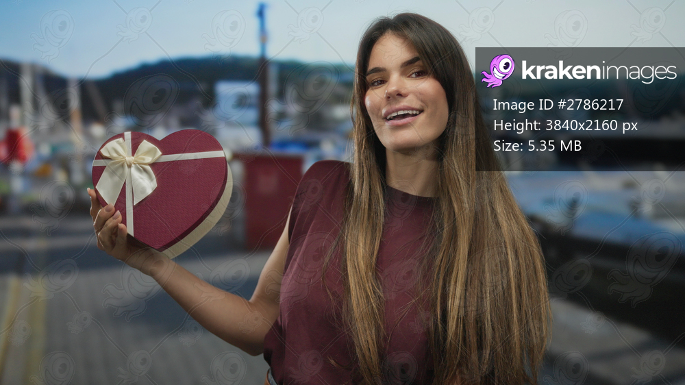 Young hispanic woman holds heart-shaped gift box near port with boats and sea in the background, smiling outdoors on a sunny day.