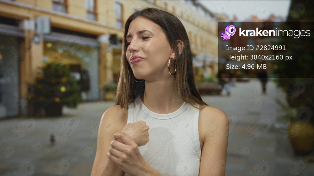 Young hispanic woman holds her wrist on a crowded city street with a pained expression and tense posture; discomfort.
