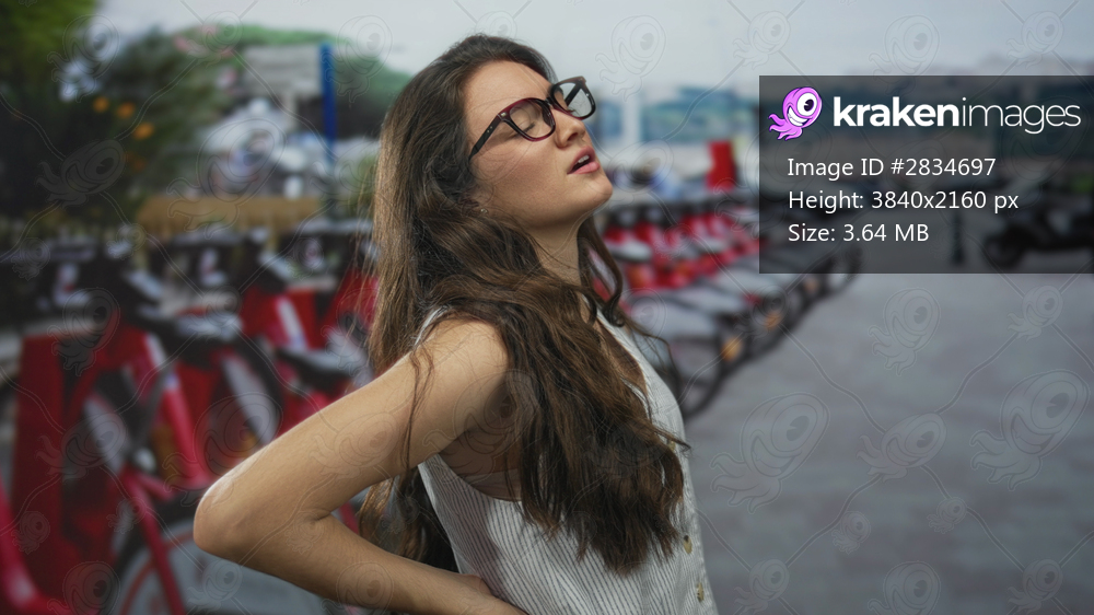 Young hispanic woman holds lower back in pain at bike rental station on busy urban city street by parked scooters; discomfort.