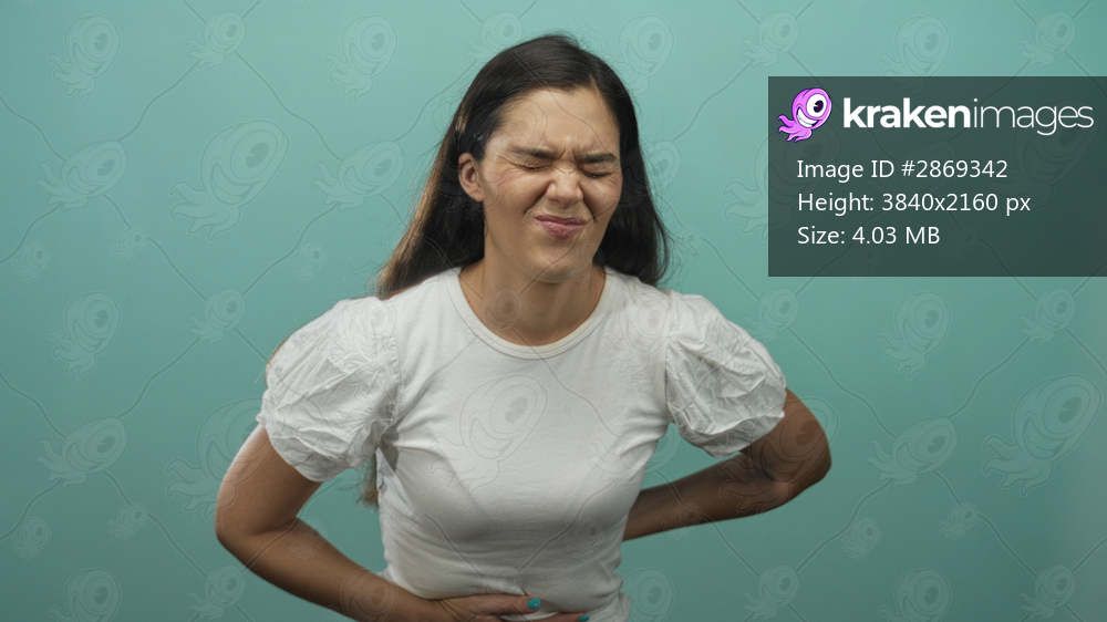 Young hispanic woman holds lower back and presses stomach while grimacing in teal studio; discomfort.