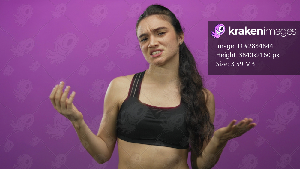 Young hispanic woman holds open palms forward in a purple studio scene; curiosity reflection insight.