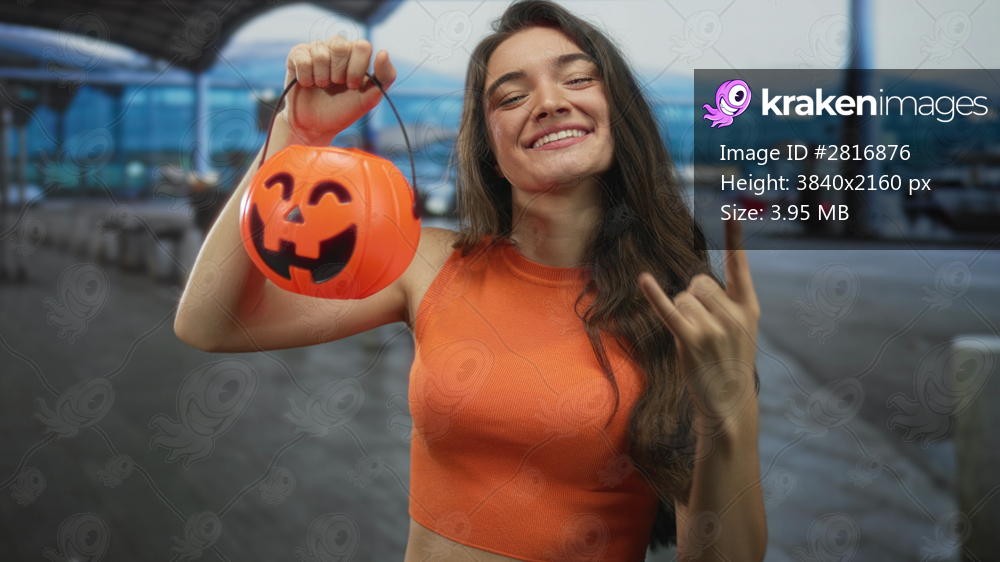 Young hispanic woman holds orange pumpkin bucket and makes rock horns at busy airport terminal; festive energy.