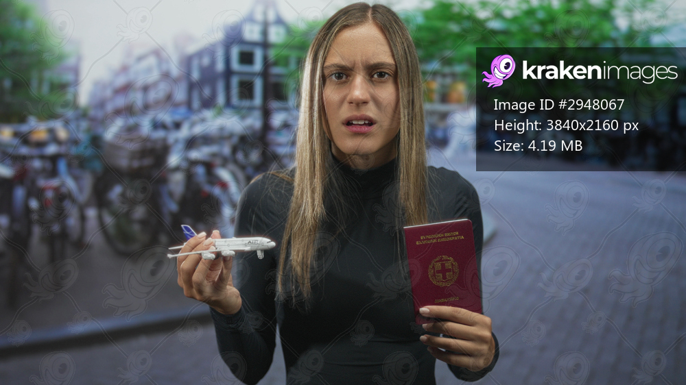 Young hispanic woman holds passport and toy airplane and grimaces while standing before parked bicycles on a city street; travel frustration.