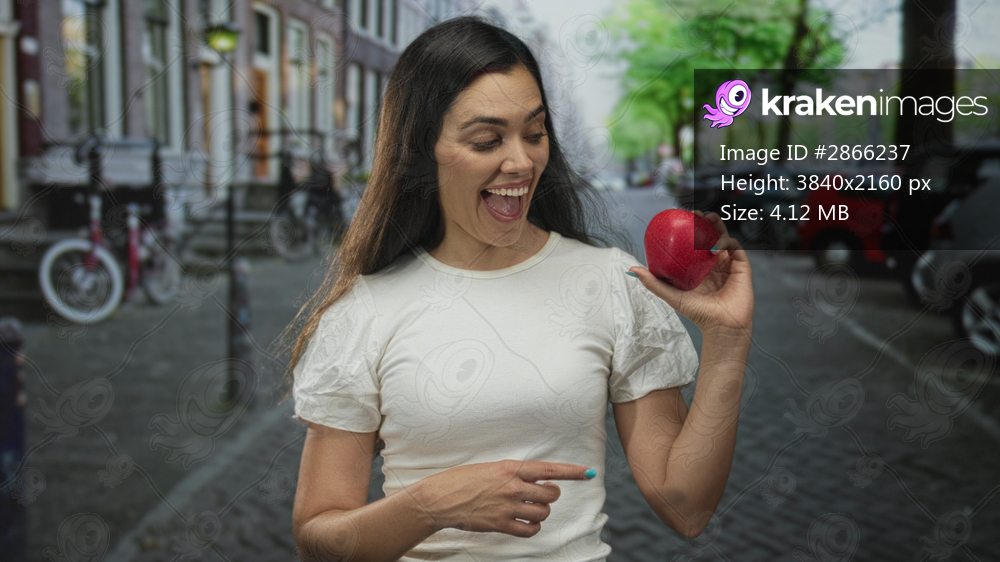 Young hispanic woman holds red apple in one hand while gazing at it on a cobblestone street lined with parked cars and bicycles; doubt.