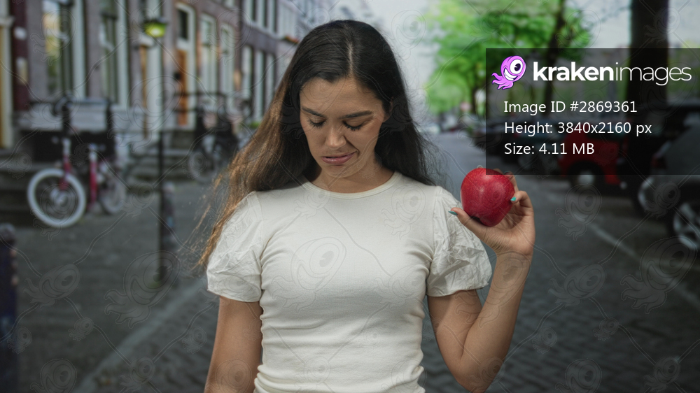 Young hispanic woman holds red apple in one hand while gazing at it on a cobblestone street lined with parked cars and bicycles; doubt.