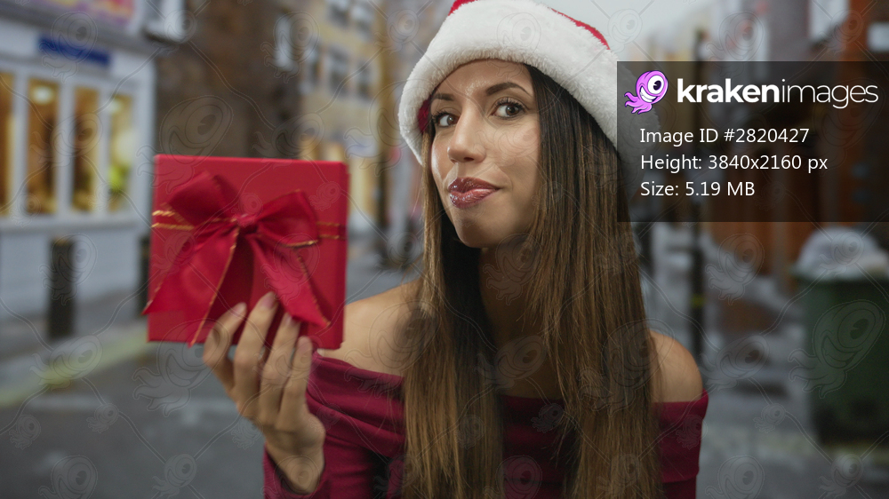 Young hispanic woman holds red gift box while smiling and wearing santa hat on wet city street with glowing storefront windows; holiday joy.