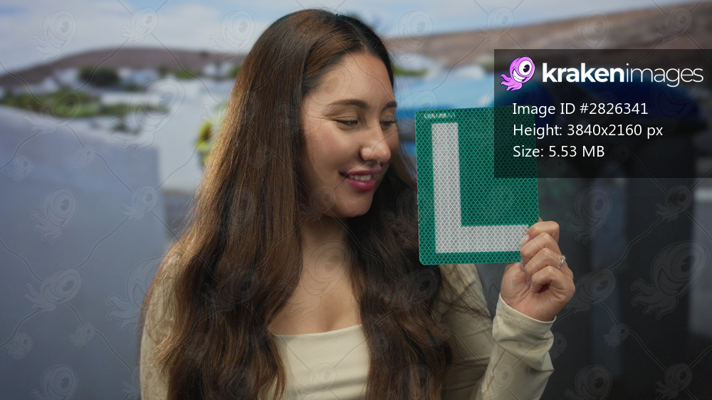 Young hispanic woman holds reflective learner plate by recycling container on city street with trash bins in view; surprise.