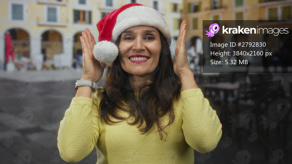 Young hispanic woman holds santa hat pom pom near ears on restaurant terrace; festive joy celebration holiday.