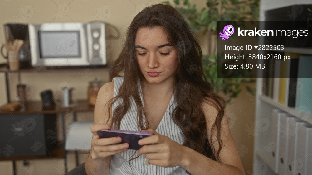Young hispanic woman holds smartphone with both hands and pumps fist high in office space; excitement.