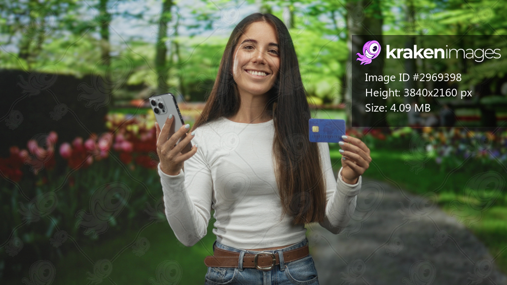Young hispanic woman holds smartphone and creditcard, smiling and showing card on a park path with flowerbeds and trees; confidence convenience.