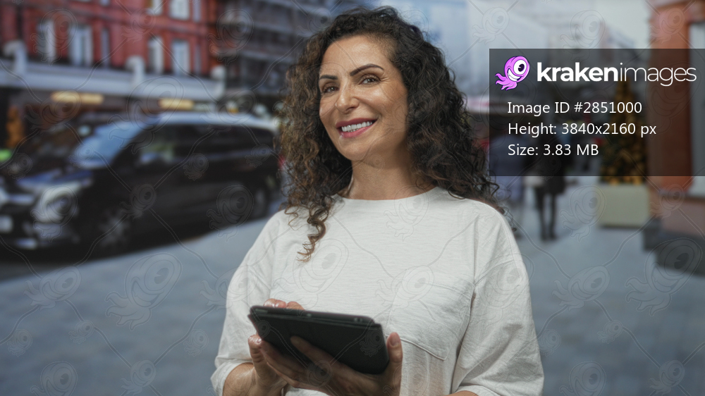 Young hispanic woman holds tablet while tapping screen on a busy urban city street in daylight; confidence.