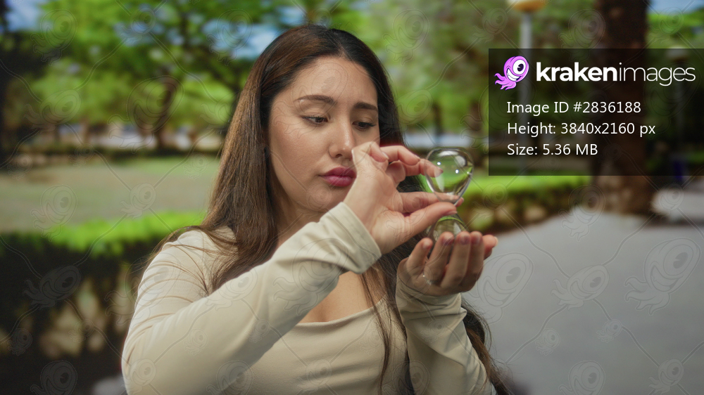 Young hispanic woman holds transparent hourglass as sand trickles in open palm amid lush green park walkway in daylight; reflection.