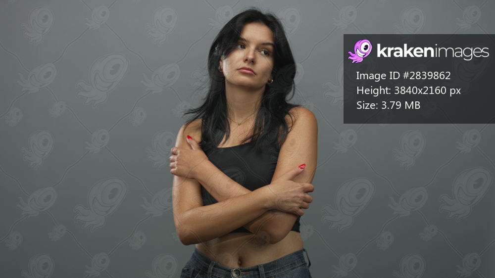 Young hispanic woman hugging bare arms in grey studio while wearing black crop top and denim jeans; serenity.