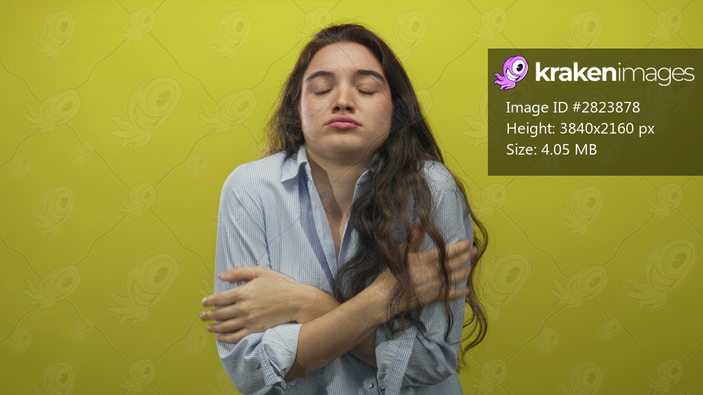 Young hispanic woman hugs herself crossing her arms in a yellow studio; self care warmth comfort serenity.