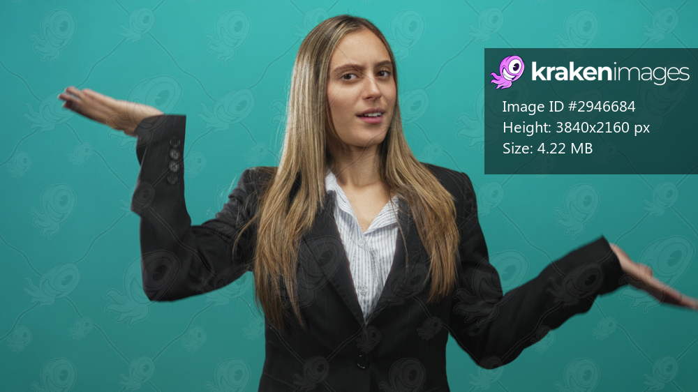 Young hispanic woman in a black blazer and striped shirt holds open palms up and shrugs against a teal studio backdrop; uncertainty.