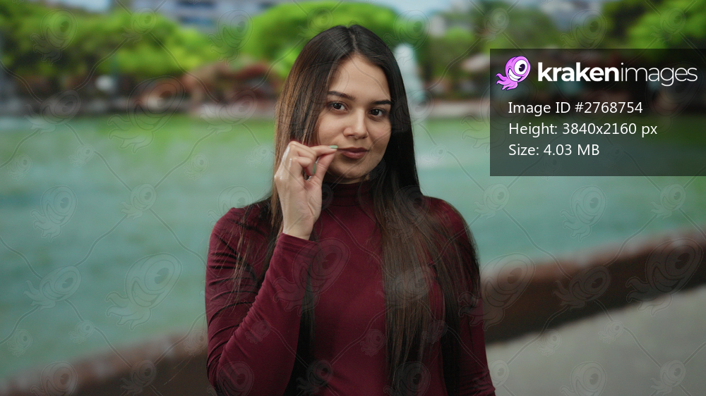 Young hispanic woman in a burgundy shirt makes a hand gesture in a serene park with a lake backdrop blending natural beauty and expression.